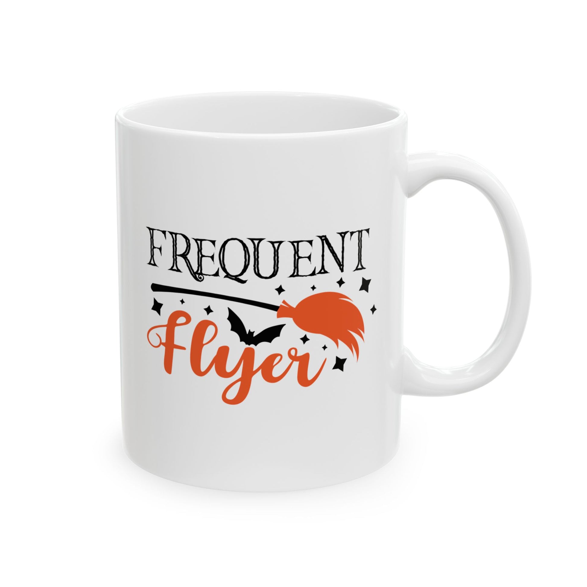 Witch Broom Ceramic Mug (11oz, 15oz) - Frequent Flyer. Enjoy your favorite beverages in this whimsical witch-themed mug that is perfect for Halloween and everyday use. The glossy finish and vibrant colors add a touch of magic to your morning routine. Suitable for microwave and dishwasher, this mug is both functional and stylish. Ideal for those who love Halloween, witches, and all things spooky.