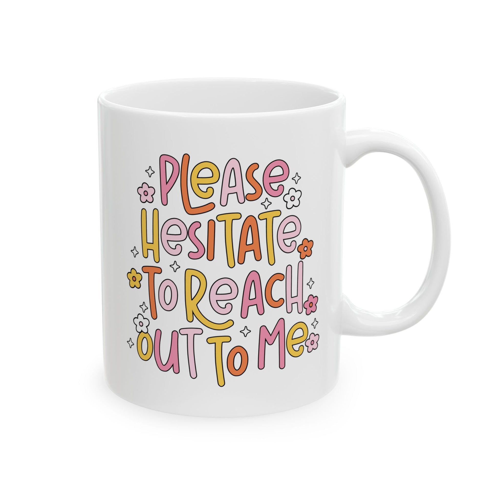 Funny office mug with the message 'Please Hesitate To Reach Out To Me'. This mug provides a light-hearted and humorous touch to your morning coffee routine, making it perfect for anyone with a playful sense of humor. Ideal for work-from-home professionals, office workers, and coffee enthusiasts. Great for gifting on birthdays, holidays, or as a pick-me-up gift during stressful times.